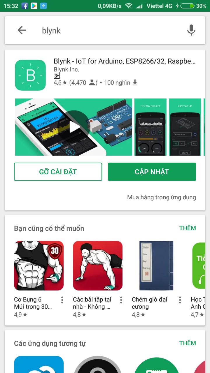 +Các bạn vào kho ứng dụng trên điện thoại (với hđh android thì vào CH- Play, với hđh ios thì vào app store) tìm kiếm ứng dụng BLYNK và tải về